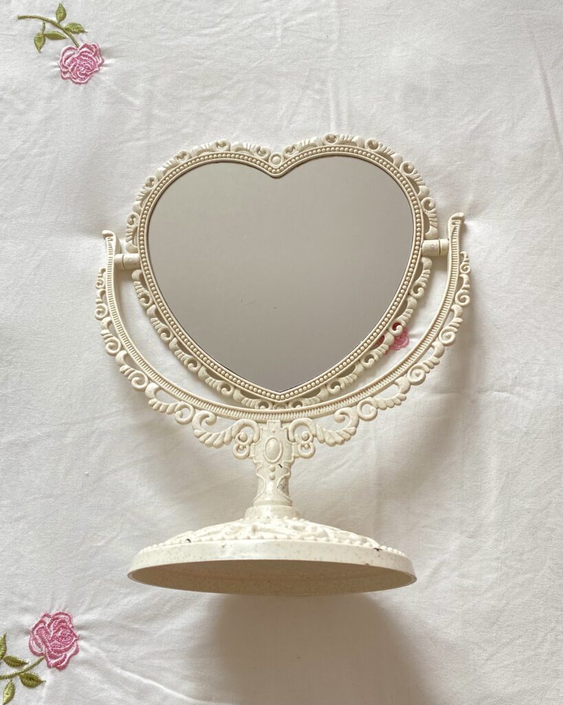 I adore using this heart-shaped mirror on my vanity – it makes every makeup moment feel extra special and adds such a sweet, romantic touch to my space. Its delicate design perfectly complements the coquette aesthetic.